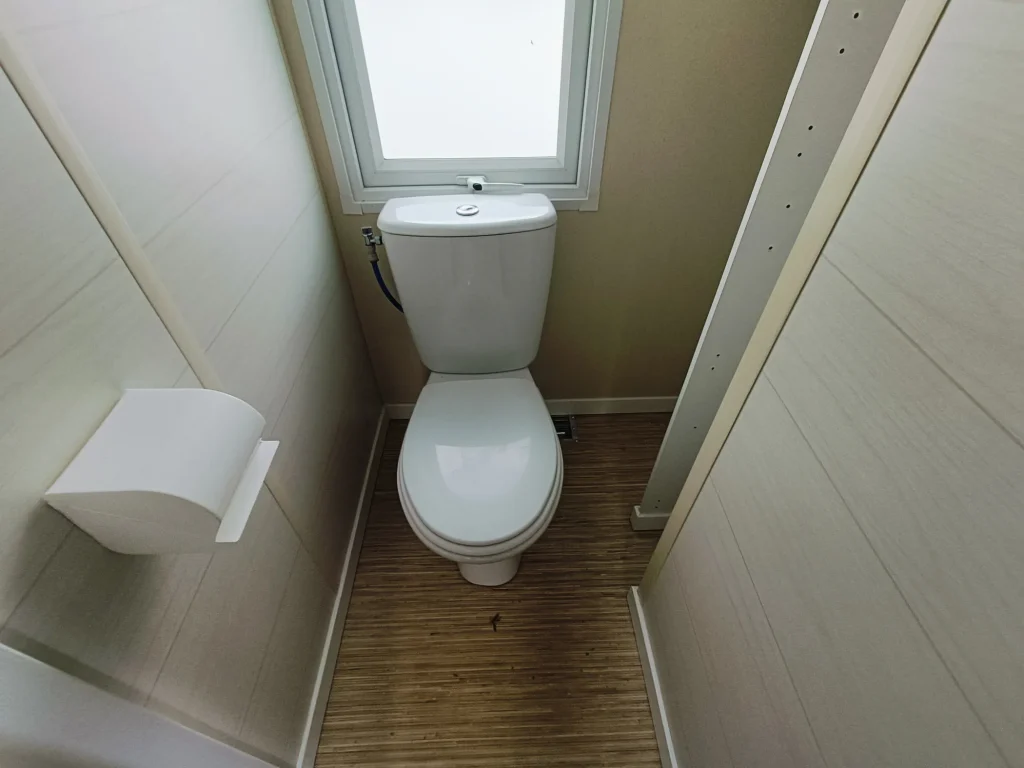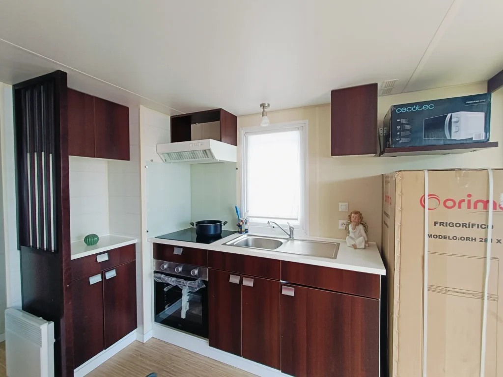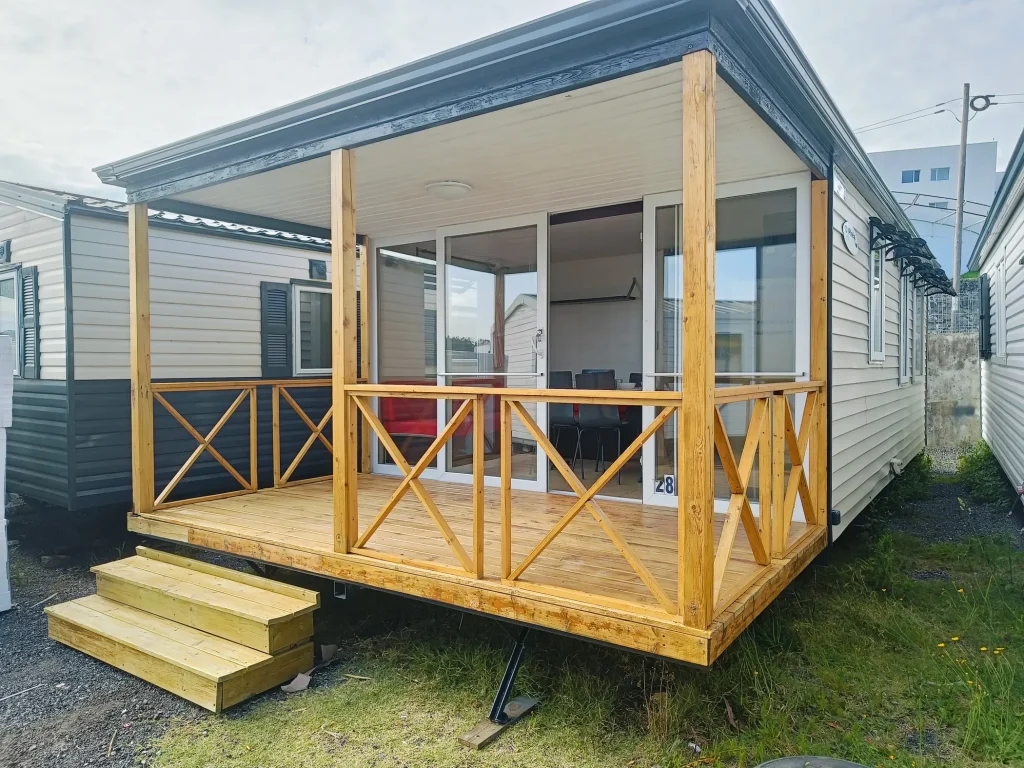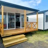 OHARA T2 Com alpendre em Madeira! Imagine-se a desfrutar de momentos relaxantes num amplo alpendre em madeira, com a luz natural a inundar o interior da sua casa através das grandes janelas com vidro duplo. Esta casa móvel oferece-lhe tudo isso e muito mais! Com um design interior acolhedor, moderno e funcional, esta casa é perfeita para quem busca uma vida mais simples e prática. Dispõe de: Alpendre espaçoso em madeira: Ideal para refeições ao ar livre, convívios com amigos e familiares ou simplesmente para relaxar e apreciar a vista. Janelas amplas com vidro duplo: Garantem um excelente isolamento térmico e acústico, além de permitirem a entrada de muita luz natural. Duas casas de banho: Uma com cabine de duche e lavatório para o seu conforto diário, e outra com sanitário para maior praticidade. 1 quarto de casal completo: Com espaço para cama de casal, roupeiro e mesas de cabeceira. 1 quarto duplo completo: Ideal para crianças, hóspedes ou como escritório.
